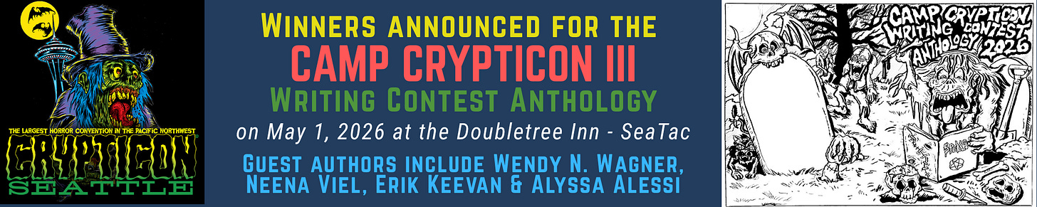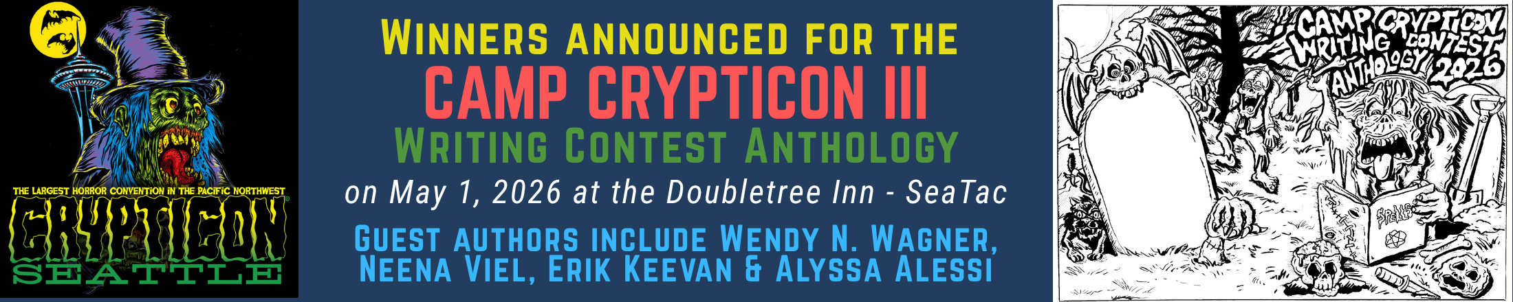 Clay Vermulm and I are putting the finishing touches on the latest Camp Crypticon writing contest anthology, which BTRS Books will launch this coming May at Crypticon Seattle (May 1-3).